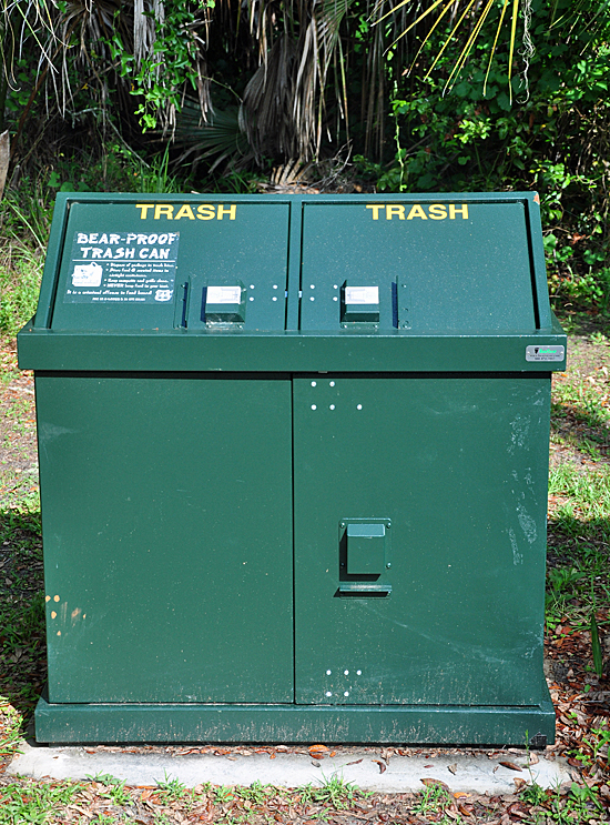 Und als wäre das alles noch nicht genug, sind in den meisten Parks auch noch sehr schöne Campgrounds, auf denen man für einen kleinen Dollar einen riesigen Stellplatz mit Tisch, Sitzbänken und Holzkohlengrill bekommt. Man muss lediglich einige Regeln beachten, über die man am Eingang aufgeklärt wird. Da es hier Bären (Florida Schwarzbären) gibt, darf man unter keinen Umständen irgendwelche Lebensmittel, bzw. Essensreste draussen lassen, Bären haben einen fantastischen Geruchssinn und riechen Futter über Kilometer hinweg. Deshalb sind die Müllcontainer auch Bear-safe, d.h. von einem Bären nicht zu öffnen.