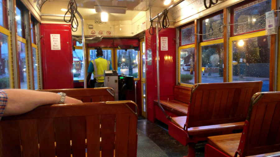 Die Fahrpreisgestaltung ist so simpel wie effektiv. Man bezahlt $1,00 pro Fahrt, jedes Umsteigen kostet 25¢, maximal aber 50¢. Oder – man kauft sich ein Tagesticket für $3,00 und kann damit – wie der Name schon sagt – den ganzen Tag fahren wie man will. Der Tramfahrer hatte kurioserweise eine Warnweste von „Transdev“ an, dazu muss man wissen, dass Transdev die Muttergesellschaft vom Meridian ist. Am Endpunkt muss man nur noch über die Strasse gehen und man ist am Anfang (oder Ende) der Frenchmen Street.