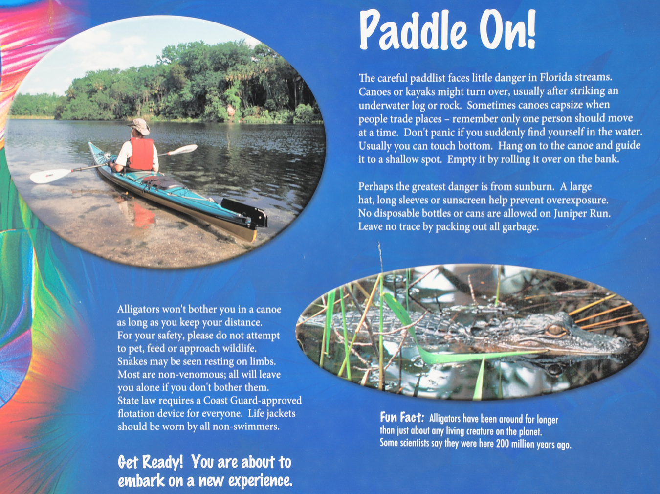 Der kleine Bach wird nach der Mühle zum Creek. Etwas weiter unten im Park kommt man an eine kleine Anlegestelle, an der man sich ein Kanu oder Kajak mieten und damit eine Fahrt den Juniper Creek hinunter über die Sweetwater Springs machen kann, bis man schließlich nach ca. 4,5 Stunden an der Mündung zum Lake George ankommt. Nun muss man praktischerweise nicht mühselig flussaufwärts zurückpaddeln, sondern wird mit einem bereit stehenden Shuttlebus zum Park zurückgefahren, ich liebe es.